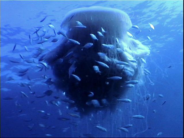 sighted in the upper mid-water with numerous symbiotic baitfish and tentacles an estimated 40 feet long. The overall condition