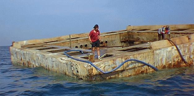 LAT: 30°03.756' N LONG: 88°36.799' W LORAN: 12404.3 47037.7-8 This target was placed offshore just 6 weeks prior to the arrival of hurricane Georges. Upon arrival, the barge was not found. After searching it was found at the above coordinates. The original coordinates were LAT: 30°03.765' N LONG:88°36.757' W LORAN: 12404.7 47037.9 29574.2. Mathematically, this computes the new position to be 199 feet at 255° from the old position. This material is unique in that it is a concrete barge measuring 50 X 50 feet square and 12 feet tall. The concrete gives it much less density than a traditional steel barge and therefore it has more buoyancy. This combined with more surface area when compared to a traditional steel barge makes it more movable. These same attributes also seem to help keep it from "rocking and wallowing" into the bottom as observed of the traditional steel barges. The surrounding depth read was 64 feet and the minimum depth was 52 feet. This compares with measurements of 61 feet and 48 feet taken during it's sinking.