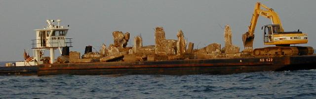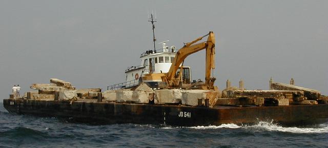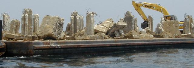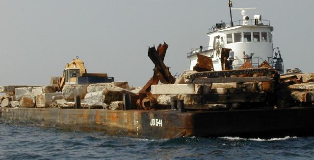 Borries construction provided Barge and Tug services while PRIMOFISH.COM provided spotter boat services. The load consisted of relatively large concrete columns and "T"'s. Surrounding depth was 56.0 feet with a minimum water clearance of 48 feet. The predicted Tide level was 0.1 feet at the time of deployment (730AM), had a range of 0.1 to 2.1 feet. Predicted High Tide was at 10:56AM and Low Tide was at 9:23PM. DGPS data was tracking 8 Satellites, had a hoop of 1.0, and an accuracy of 8 feet. The material was deployed in the southeast corner of the Site within a 150 foot radius centered at the following coordinates: