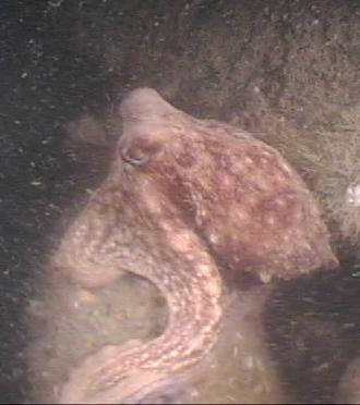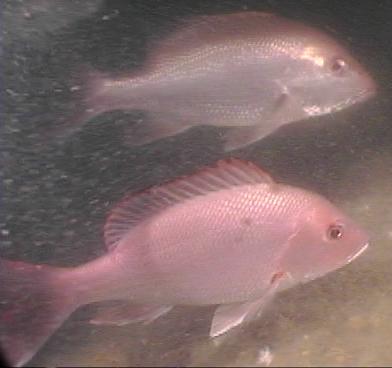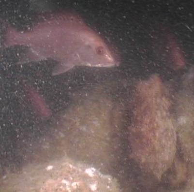 This Rubble pile was sunk on August 28, 1996 utilizing Tidelands funds at Latitude 30°02.090' and Longitude 88°31.960'. The Loran Coordinates are 12453.5, 47031.3. The surrounding depth is 74' with a fairly concentrated 2'-3' relief of rubble. Visibility was only about 5 feet at the bottom and was so poor through the water column that lighting was very low making the dive seem almost like a night dive. Even with the poor visibility, an abundance of red snapper (175-200) and gag grouper (15-20) were observed. Sizes ranged from 2 to 25 pounds on the snapper and 5-20 pounds on the grouper. Storm damage was not as apparent on this material, compared to the nearby barge observations, although there were much fewer sightings of sea anemones, arrow crabs, and invertebrates than were made on this same material this past July. Over sedimentation was not observed and material relief above the bottom was still satisfactory. Finger Corals were still thriving on this material, unlike what was observed at the ladnier barge. An octopus (about 3 lbs. In size) was also sighted on the dive. Some of the captured video images are shown below.